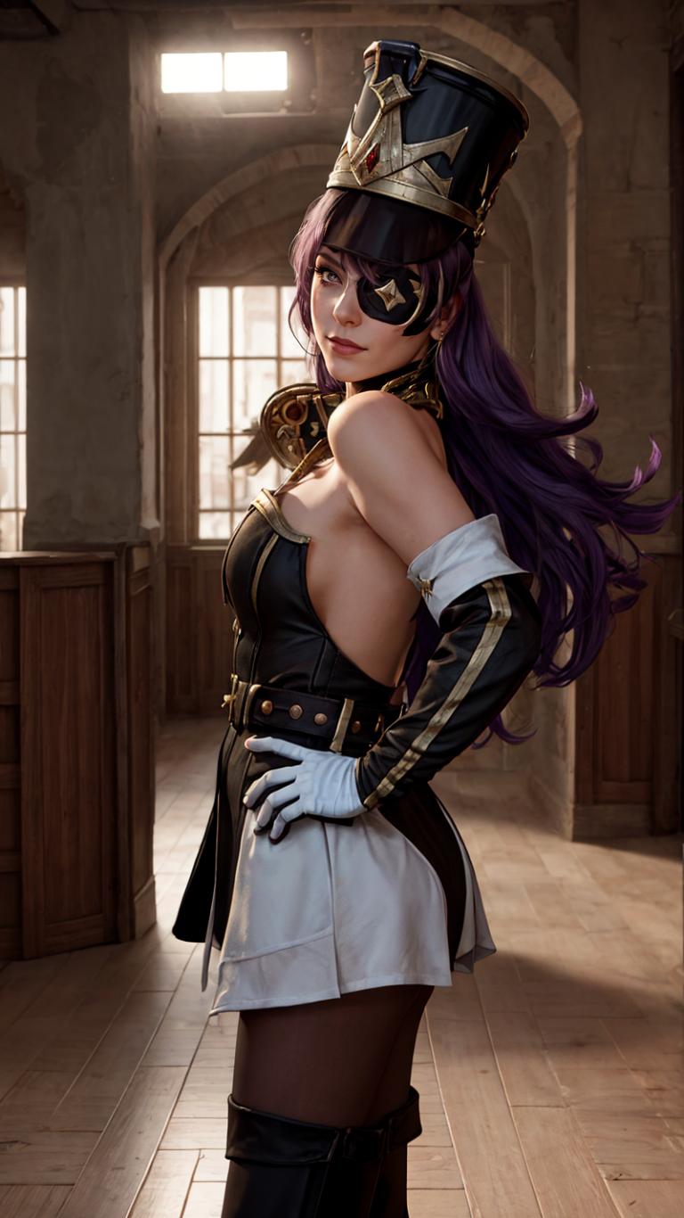 | Prompt | <lora:Chevreuse:0.9>chevreuse, bare_shoulders, gloves, pantyhose, long purple_hair in the wind, white_thighhighs, thigh_boots, ,solo, shako_cap,