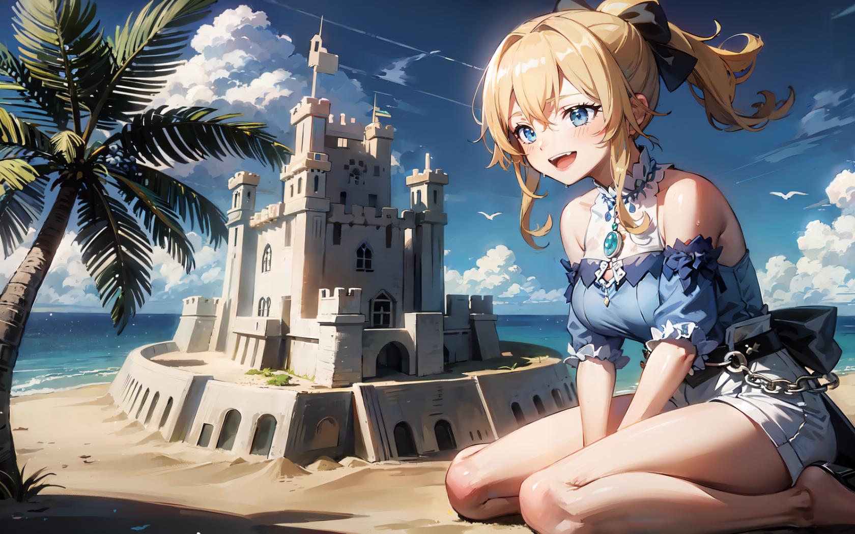 1girl, :d, bangs, bare shoulders, beach, between legs, bird, black bow, blonde hair, blue eyes, blue shirt, blue sky, blush, bow, cloud, day, detached sleeves, frilled sleeves, hair bow, jewelry, long hair, medium breasts, ocean, official alternate costume, open mouth, outdoors, palm tree, ponytail, sand, sand castle , sand sculpture, sandals, shirt, shore, short sleeves, shorts, sidelocks, sitting, sky, sleeveless shirt, smile, solo, tree, wariza, white shorts