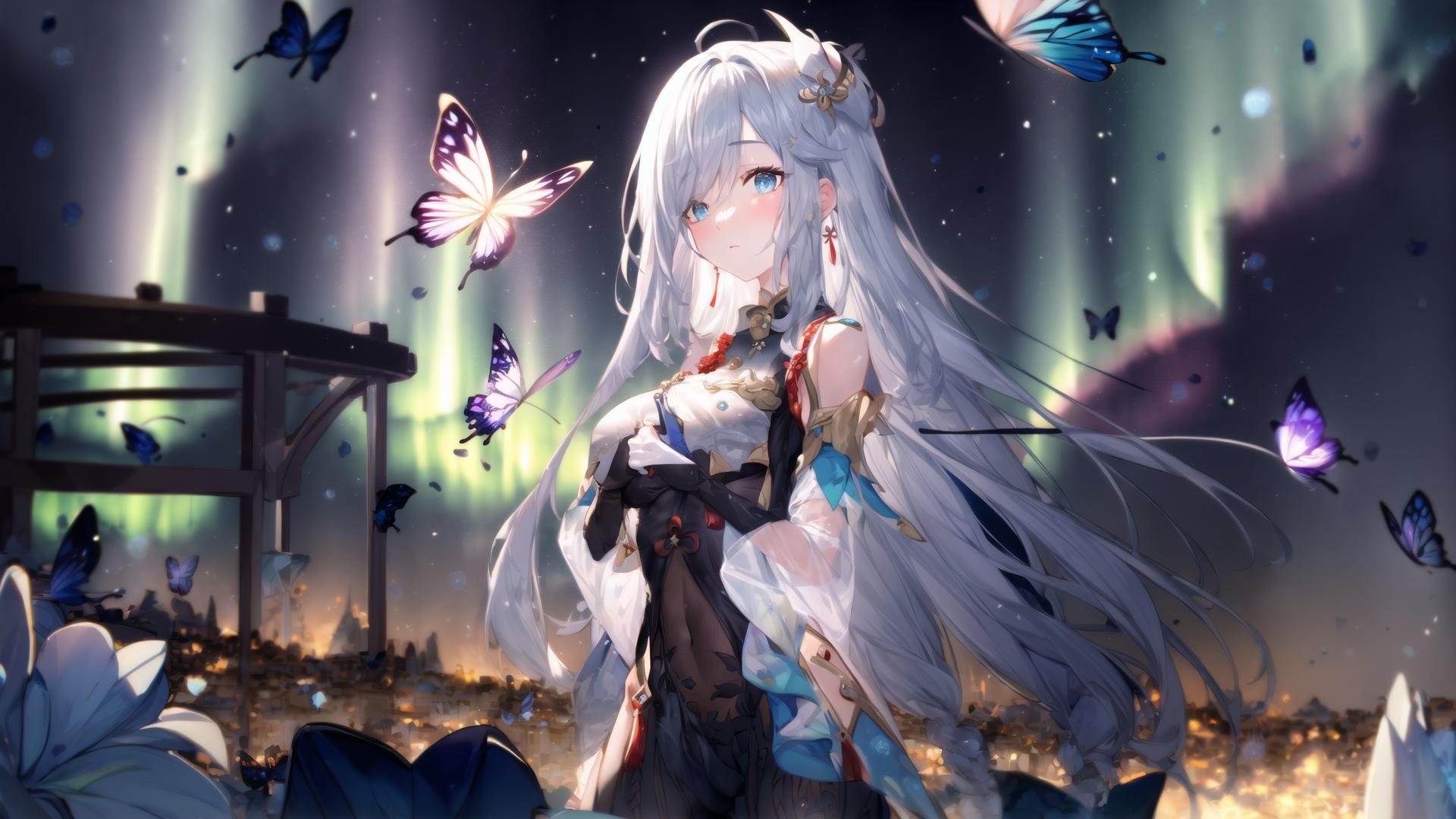 | Prompt | (highly detailed:1.5),(dramatic,romantic:1.2), (perfect artwork), best quality,(8k), (4k),(Masterpiece), (Best Quality), extremely detailed, intricate, hyper detailed, illustration, clearly worked out detail, intricate, cinematic,(depth of field), <lora:shenhe2:1>shenhedef, long white hair in the wind,((medium breast)), night, snow, snowflakes,mist,white flowers, ((moon,galaxy background,aurora borealis)), butterfly, (sad, pensive), snowy mountains, |